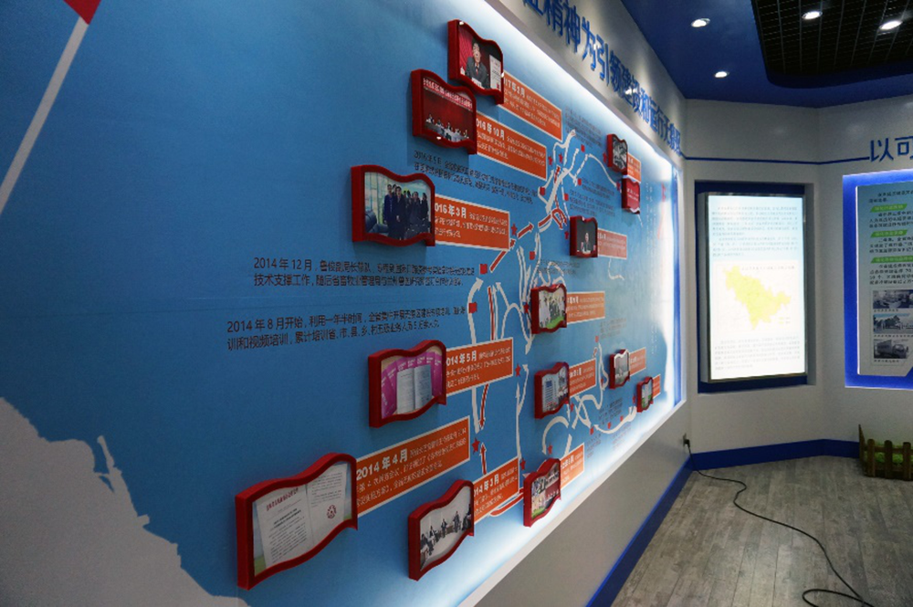 整體風格生動活躍,形式豐富。展室的中間設置了一個超大電子沙盤,可觸控操作,在地圖上查找相關信息。周圍展示墻面配以生動的圖片展示。仿真動物的裝飾,渲染了氛圍,也強化了主題。